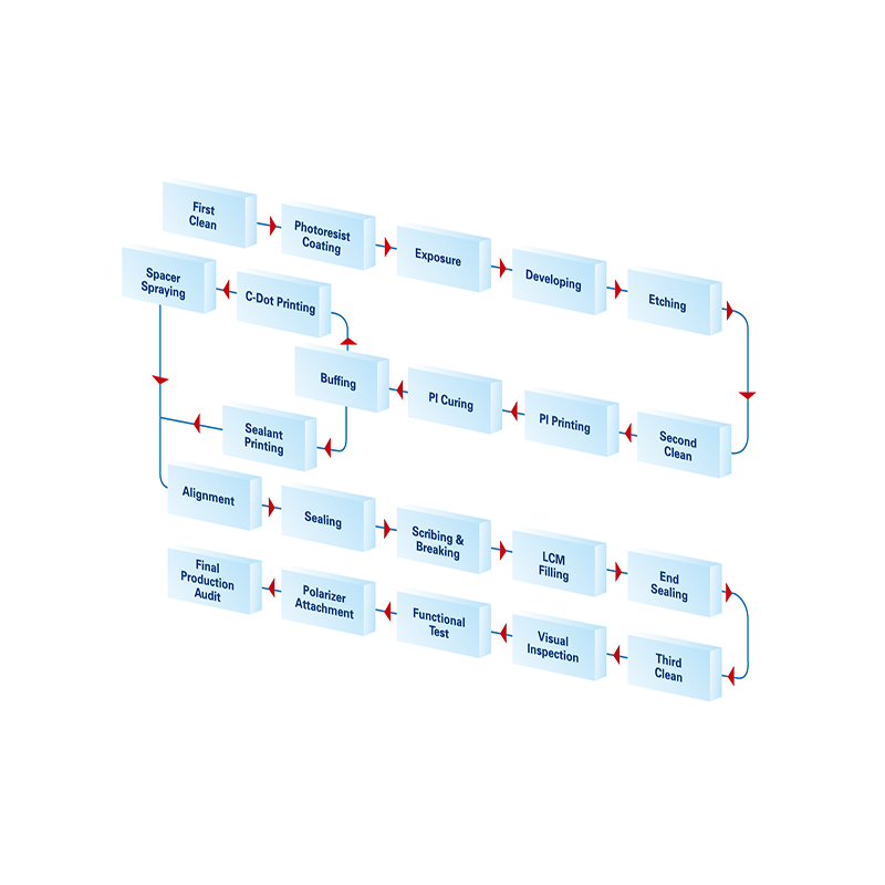 The production of LCD products begins with the input of ITO glass and ends with the Final Production Audit process. It involves a total of 22 main processes and 3–5 auxiliary processes. Before the alignment process, production follows a streamlined assembly line, involving steps such as photoresist and PI coating with temperature-controlled curing. The subsequent processes rely on automated equipment, involving equipment calibration and raw material segmentation. This results in longer production times and lower efficiency for small-batch orders. Unlike mechanical processing, producing 100 pieces or 1,000 pieces of LCD products takes almost the same amount of time, as all production processes must be completed. Additionally, certain products require extra special treatments (such as ultra-small size PIN installation, multiple photolithography steps, special-shaped processing, multi-color screen printing, freezing tests, etc.), which also extend the production cycle.